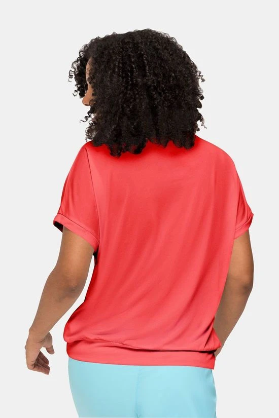 - Dit shirt met korte mouwen heeft ook een vrouwelijke ronde hals en een subtiele graphic op de borst.